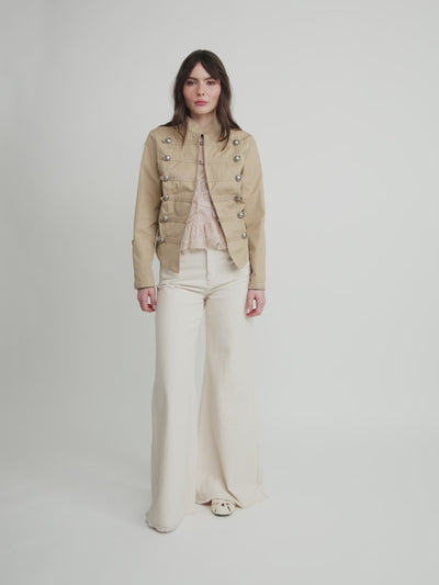 Cette veste d'inspiration militaire allie la coupe militaire à un style contemporain. Ornée de boutons argentés décoratifs et dotée d'une silhouette structurée, elle offre une allure élégante et raffinée, tout en assurant un confort optimal. Sa coupe ajustée met en valeur la silhouette, tandis que sa légèreté garantit un confort tout au long de la journée. Idéale pour rehausser une tenue décontractée ou apporter une touche d'originalité à une occasion formelle.
